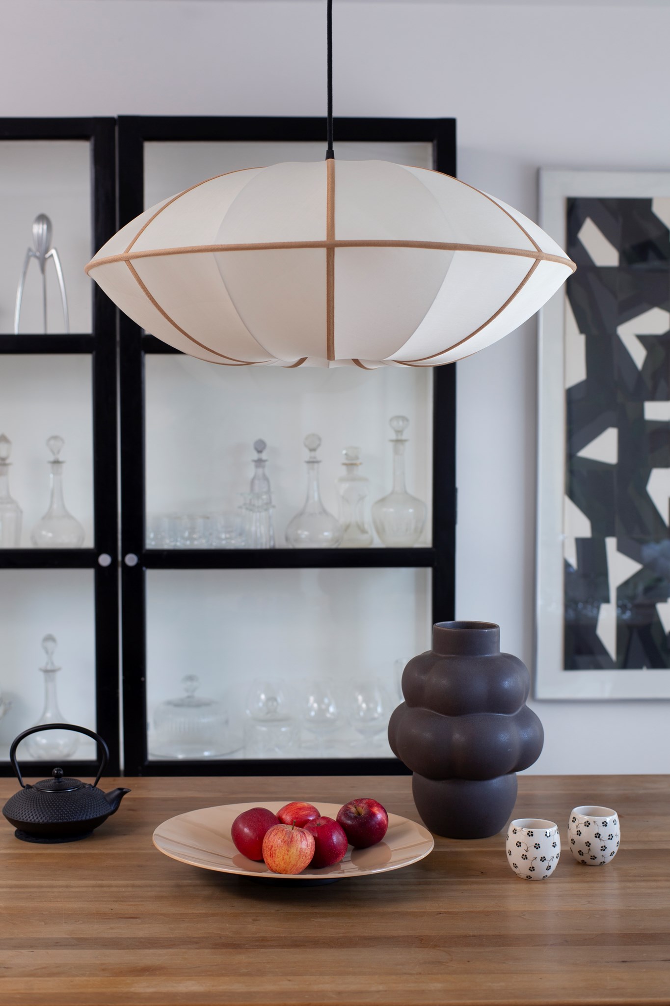 Flacher Lampenschirm bespannt in reiner oder Off-White Seide und einer Auswahl an farbigen Baumwollbändern, die von oben bis unten verlaufen. Lampenpendel und Fassung sind nicht im Lieferumfang enthalten.